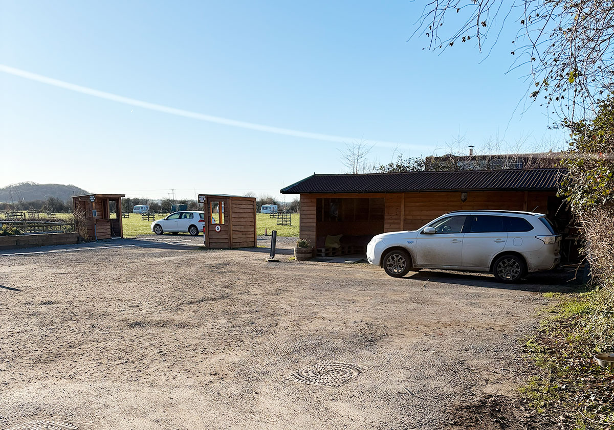 Arrival area with gravel and grass surfaces. Parking is close to pitches.
